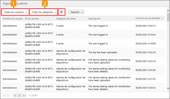 La página [Registro de auditoría] solo se muestra a los usuarios que tienen asignado el rol de administrador del sistema. |