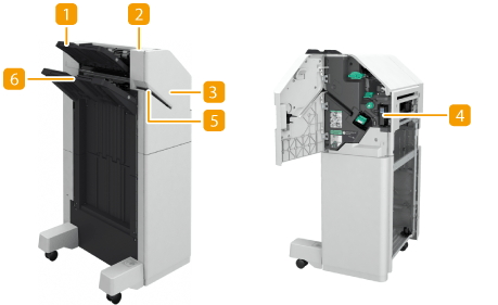 The maximum number of bindable sheets may not be possible, depending on the paper type. In this case, change the paper type, or reduce the number of sheets to bind. Collate and groupIf you select <Offset> in combination with the collate or group function, each printout group is shifted. Once an output tray has reached its stacking limit, subsequent prints are automatically delivered to the next available tray. If all of the available trays have reached their stacking limits, printing stops. Remove all of the output paper from the trays to resume printing. StaplersWhen you are using the Staple mode, do not remove the stack of paper from the output tray during the job. Remove the stack of paper when the job has been completed. If the <Load staples into the stapler unit.> message appears, almost all of the staples have been used. To proceed, replace the staple cartridge. If a tray reaches the lowest position limit, printing stops temporarily. Remove all of the output paper from the tray to resume printing. |