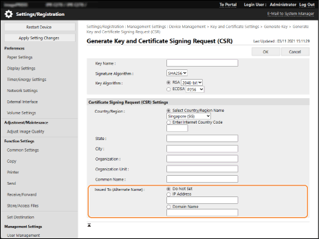 <Issued To (Alternate Name)> can be set when generating a key and Certificate Signing Request (CSR) using Remote UI.