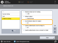 <Use Destination Name for Subject> | <On>, <Off> | Sim | Não | Sim | Não | C | Settings/Registration Basic Information |