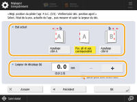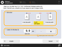 4 | Sélectionnez l’état actuel de la position du pli et réglez la largeur de décalage, puis appuyez sur <Suivant>. Vérifiez l’état actuel de la position du pli et de la largeur de décalage sur la page de test. |