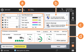 Vous pouvez désormais afficher un écran permettant de vérifier l'état de plusieurs éléments ensemble, tels que les quantités restantes de papier et de toner, l'état des mesures de sécurité de l'appareil, les informations d'assistance pour la résolution des problèmes survenant pendant l'impression et la télécopie, et l'état des tâches d'impression et la consommation électrique pendant une période spécifiée.