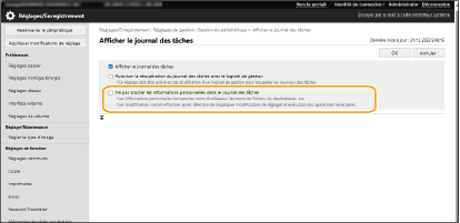 Il est désormais possible d'interdire l'écriture d'informations personnelles telles que le nom de l'utilisateur, le nom du fichier et la destination dans le journal des travaux et le journal d'audit.