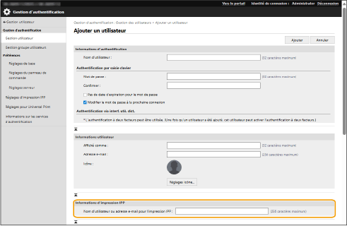 Lors de l'enregistrement des informations sur l'utilisateur, vous pouvez désormais définir le nom de l'utilisateur ou l'adresse e-mail utilisée pour l'impression IPP. Défini lors de l'association d'utilisateurs enregistrés à des travaux d'impression IPP.