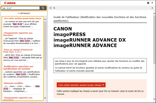 Faire une recherche dans une page de listeEffectuer une recherche par mot-cléVous pouvez saisir le nom d'une version en tant que mot-clé (par exemple "Ver. 3.11") pour afficher toutes les pages comprenant ce mot-clé. Vous pouvez alors poursuivre votre recherche dans les pages listées. |