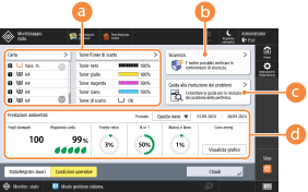 Ora è possibile visualizzare una schermata per verificare lo stato di più elementi insieme, come la quantità rimanente di carta e toner, lo stato delle misure di sicurezza della macchina, le informazioni di supporto per la risoluzione dei problemi che si verificano durante l'invio di fax e la stampa, lo stato dei lavori di stampa e il consumo di energia in un periodo di tempo specificato.
