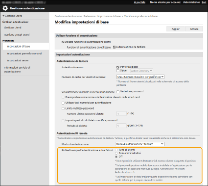Ora è possibile richiedere agli utenti registrati di effettuare l’autenticazione a due fattori quando accedono alla IU remota. Selezionare la casella di controllo per richiedere l’autenticazione a due fattori.