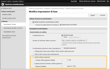 È ora possibile impedire l’uso di una password che è già stata utilizzata quando gli utenti cambiano la loro password. Selezionare la casella di controllo [Limita riutilizzo password] e configurare il conteggio delle password precedenti perché tenga conto di questa impostazione.