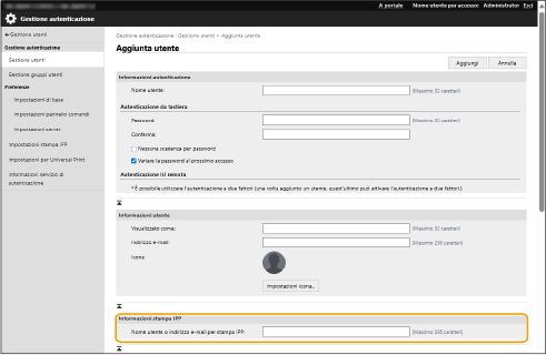 Quando si registrano le informazioni sull'utente, è ora possibile impostare il nome dell'utente o l'indirizzo e-mail utilizzato per la stampa IPP. Impostare quando si associano gli utenti registrati ai lavori di stampa IPP.