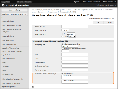 Quando è selezionata l'opzione <RSA>: <Lunghezza chiave (bit)>: <512>, <1024>, <2048>, <4096> | Sì | Sì | Sì | No | No | - | |
