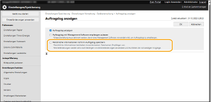 Es ist nun möglich, das Schreiben von persönlichen Informationen wie Benutzername, Dateiname und Zielort in das Auftrags- und Auditprotokoll zu verbieten.
