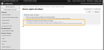 Ahora es posible prohibir la escritura de información personal como el nombre de usuario, el nombre de archivo y el destino en el registro de tareas y el registro de auditoría.