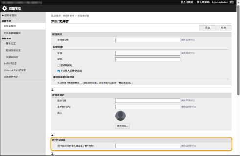 註冊使用者資訊時,現在可以設定用於 IPP 列印的使用者名稱或郵件地址。將已註冊使用者與 IPP 列印工作關聯時設定。
