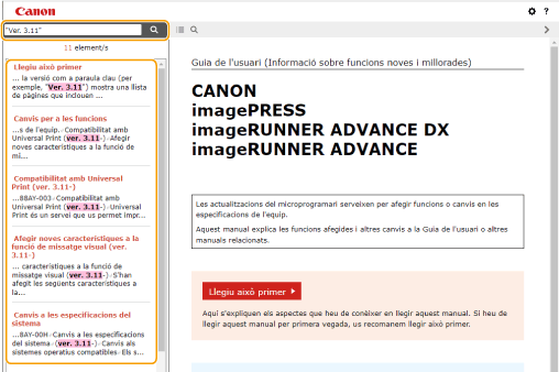 Pàgina de llista de cercaCerca per paraula clauLa cerca ingressant la versió com a paraula clau (per exemple, "Ver. 3.11") mostra una llista de pàgines que inclouen aquesta paraula clau. A continuació, podeu buscar a les pàgines enumerades. |