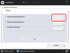 El almacenamiento no se puede inicializar en las siguientes condiciones: Cuando se están recibiendo o imprimiendo datos. (Se recomienda quitar el cable que conecta el equipo al concentrador para que la misma no reciba datos de impresión). Cuando se están instalando o desinstalando fuentes. Los pasos explicados a continuación son para inicializar el área de almacenamiento PCL. Para inicializar el área de almacenamiento PS, siga los mismos pasos excepto el paso 4, donde deberá seleccionar [Inicializar almacenamiento PS]. |