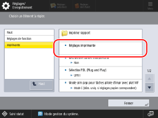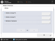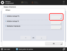 La zone de stockage ne peut pas être initialisée dans les conditions suivantes : Réception ou impression de données d'impression. (Il est recommandé de débrancher le câble reliant la machine au concentrateur, pour empêcher la réception des données d'impression.) Installation ou désinstallation de polices. Les étapes décrites ci-après concernent l'initialisation de la zone de stockage PCL. Pour initialiser la zone de stockage PS, procéder de la même façon, en ignorant l'étape 4, sélectionner [Initialiser stockage PS]. |