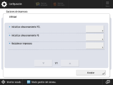 El almacenamiento no se puede inicializar en las siguientes condiciones: Cuando se están recibiendo o imprimiendo datos. (Se recomienda quitar el cable que conecta el equipo al concentrador para que la misma no reciba datos de impresión). Cuando se están instalando o desinstalando fuentes. Los pasos explicados a continuación son para inicializar el área de almacenamiento PCL. Para inicializar el área de almacenamiento PS, siga los mismos pasos excepto el paso 4, donde deberá seleccionar [Inicializar almacenamiento PS]. |