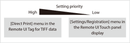 Settings specified with either tags in the IFD (Image File Directory) held in the header of TIFF data of an image file or with the 'Direct Print' menu in the Remote UI take priority over settings specified with the touch panel or Remote UI.