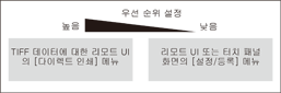 이미지 파일의 TIFF 데이터 헤더 또는 리모트 UI에 있는 ‘다이렉트 인쇄’ 메뉴에서 IFD(Image File Directory)의 태그에 지정된 설정이 터치 패널이나 리모트 UI에 지정된 설정보다 우선순위를 갖습니다.