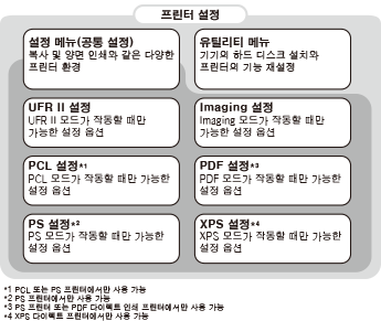 다음 메뉴는 프린터 설정 메뉴에 포함되어 있습니다.