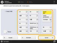 1 | Appuyez sur <Format personnalisé>. ![]() Vous pouvez spécifier la taille de papier <Format libre>, vous n'aurez alors pas besoin d'indiquer le réglage de la taille de papier. Spécifiez <Format libre> lorsque vous chargez du papier de taille inconnue pour faire des photocopies ou lorsque la taille de papier est déjà enregistrée dans le pilote de l'imprimante. |