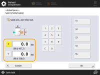 Appuyez sur <X> ou <Y> pour saisir la longueur de chaque côté avec le clavier numérique. ![]() Si vous enregistrez les formats de papier que vous utilisez fréquemment avec les boutons <S1> à <S5>, vous pouvez les appeler en appuyant sur une seule touche. Enregistrement de papier de format libre (papier de format personnalisé) | |