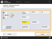 2 | Sélectionnez l'orientation et le type d'enveloppes. ![]() Si vous modifiez le placement des enveloppes, appuyez sur <alimentation bord court> ou <Alimentation bord long>, et sélectionnez le type d'enveloppe. Pour enregistrer une enveloppe de taille personnalisée, appuyez sur <Personnalisé> <Suivant> et appuyez sur <X> ou <Y> pour spécifier le côté, puis utilisez le clavier numérique pour saisir la longueur du côté spécifié. |