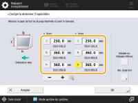 Revenez à l’écran <Corriger la distorsion (Trapézoïde)>, et saisissez la longueur mesurée de <b> et de <h> pour les côtés avant et arrière.En utilisant les deux valeurs numériques suivantes et « c = 250,0 », un dispositif règle la longueur pour corriger la distorsion sur la zone d’impression.