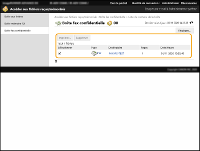 Vous pouvez utiliser l'interface utilisateur distante pour imprimer, envoyer ou supprimer des fichiers qui sont stockés dans la boîte courrier ou des fax et I-faxes qui sont temporairement stockés dans la boîte courrier Fax/I-Fax.