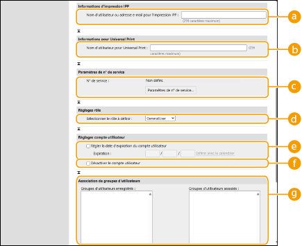 [N° de service :]Si vous utilisez la gestion des numéros de service, vous devez cliquer sur [Paramètres de n° de service...] et sélectionner le numéro de service à attribuer à l'utilisateur. Enregistrez d'abord les numéros de service nécessaires dans [Mémoriser nouveau service...] sur l'écran de liste. Si le numéro de service que vous spécifiez ici est par la suite supprimé, n'oubliez pas de changer ce réglage.