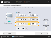 Tornare alla schermata <Correzione distorsione (Parallelogrammo)> e inserire la lunghezza misurata di <g> e <a> sia per il lato anteriore che per quello posteriore.Usando i due valori numerici seguenti e "c = 250,0", un dispositivo regola la lunghezza per correggere la distorsione sull'area di stampa.