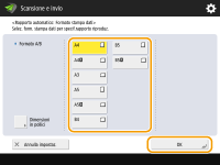 Per registrare il formato della scansioneSe si specifica frequentemente il formato di scansione con gli stessi valori, registrare il formato in <Personalizz.> <Registrazione formato> per richiamare rapidamente le impostazioni per comodità.Se è specificato il formato della scansioneI documenti acquisiti con un formato di scansione specificato (<Person.>, <Originale lungo> o <Formato libero>), non possono essere memorizzati in una mailbox. Se è in uso la funzione <Scansione e memorizzazione>, non è possibile selezionare <Originale lungo>. |