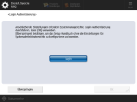 Nehmen Sie eine authentisierte Anmeldung vor, um die Einstellungen zu konfigurieren, für die Administratorberechtigungen erforderlich sind. ![]() ![]() Drücken Sie <Login> und geben Sie den Benutzernamen und das Passwort eines Benutzers mit Administratorrechten ein. Der standardmäßige Benutzername für den Administrator lautet "Administrator" und das standardmäßige Passwort lautet "7654321". Drücken Sie erneut <Login> und anschließend <OK>. Wenn Sie das werkseitig eingestellte Standardpasswort eingeben, werden Sie aufgefordert, dass Passwort zu ändern. Sie können das Passwort auch später ändern. Anmelden als Administrator Sie können die Einstellungen, die Administratorberechtigungen erfordern, überspringen und mit dem nächsten Schritt fortfahren, indem Sie <Überspringen> drücken. Fahren Sie in diesem Fall mit Schritt 10 fort. | |
