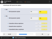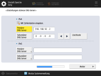Legen Sie die DNS-Serveradresse, den DNS-Hostnamen und den DNS-Domänennamen fest. ![]() ![]() Drücken Sie <Primärer DNS-Server> und <Sekundärer DNS-Server>, geben Sie eine IPV4/IPv6-Adresse für den DNS-Server ein, und drücken Sie <Weiter>. Weitere Informationen zu den Einstellungen der DNS-Serveradresse finden Sie unter Vornehmen von DNS-Einstellungen. ![]() ![]() Drücken Sie <Hostname>, um den Namen des Geräts (Hostnamen) einzugeben. Drücken Sie <Domänname>, um den Domänennamen für das Gerät einzugeben, und drücken Sie dann <Weiter>. Wenn die Einstellungen von IPv4 und IPv6 identisch sind, drücken Sie bei <Denselben Hostnamen/Domännamen wie IPv4 verwenden> auf <Ein>. ![]() ![]() Um die Aktualisierung automatisch mit den Einstellungen für dynamische DNS-Aktualisierungen vorzunehmen, drücken Sie bei <DNS Dynamisches Update> auf <Ein> und anschließend <OK>. Wenn Sie <DNS Dynamisches Update> bei <IPv6> auf <Ein> setzen, wählen Sie <Ein>, damit die Elemente automatisch registriert werden. | |