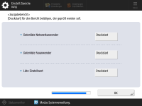 Sie können die Netzwerkanwenderliste, die Liste der Faxanwenderdaten und die Liste der angepassten Werte drucken. ![]() ![]() Drücken Sie <Druckstart> für den Bericht, den Sie drucken möchten. Drücken Sie <OK>, wenn der Druckvorgang abgeschlossen ist oder Sie keine Liste drucken. | |