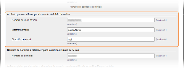 4 | Especifique cómo configurar los nombres de atributos y el nombre de dominio. ![]() [Nombre de usuario (Autenticación mediante teclado):]Especifique el campo de datos LDAP (nombre de atributo) del nombre de usuario en el servidor LDAP (Ejemplo: uid). [Nombre de inicio sesión:] / [Mostrar nombre] / [Dirección de e-mail]Especifique los campos de datos (nombres de atributo) del nombre de inicio de sesión, el nombre visualizado y la dirección de correo electrónico de cada cuenta de usuario en el servidor LDAP (Ejemplo: uid, cn, mail). [Especifique el nombre de dominio] / [Especifique el nombre de atributo para la adquisición del nombre de dominio]Seleccione cómo configurar el nombre de dominio del destino de inicio de sesión. Para especificar el nombre de dominio directamente, seleccione [Especifique el nombre de dominio] e introduzca el nombre de dominio. Para especificar un campo de datos LDAP (nombre de atributos) desde el que adquirir el nombre de dominio en el servidor LDAP, seleccione [Especifique el nombre de atributo para la adquisición del nombre de dominio] e introduzca el nombre de atributo (Ejemplo: dc). |