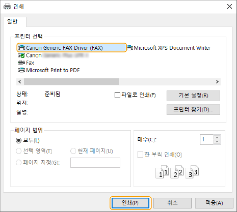기기를 선택하고 [인쇄] 또는 [확인]을 클릭하십시오.