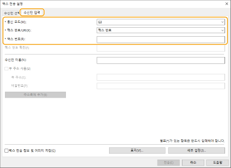 [수신인 입력] 탭을 클릭하고 통신 모드와 사용 중인 팩스 번호를 지정하십시오.