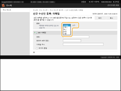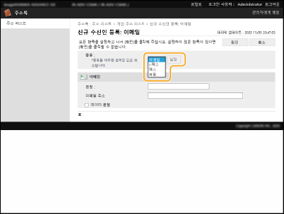 1 | 수신인을 등록할 주소 목록을 클릭합니다([개인 주소 리스트], 사용자 그룹 주소 목록, [주소 리스트 01] ~ [주소 리스트 10] 또는 [관리자용 주소 리스트]). [개인 주소 리스트]는 로그인한 사용자만 사용할 수 있으며 개인 인증 관리가 활성화 됬을 때만 사용이 가능합니다. [관리자용 주소 리스트]는 관리자 또는 장치 관리자 권한으로 로그인한 사용자만 사용할 수 있습니다. PIN 입력 페이지가 표시되면 PIN 입력 후 [확인]을 클릭합니다. 등록된 사용자 그룹과 수신인을 공유하려면 등록된 사용자 그룹 주소 목록을 선택합니다. ![]() 또한 관리자 권한이 있는 사용자만 리모트 UI에서 수신인을 등록/편집할 수 있도록 허용하여 사용자 그룹 주소 목록을 관리할 수 있습니다. <사용자 그룹 주소 리스트를 사용> |