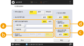 기기 SMTP 서버가 이메일 및 I-팩스를 수신하게 하려면 <설정>을 누릅니다. DNS 서버 기기의 호스트 이름을 등록하지 않으면 SMTP를 통해 수신할 수 없습니다.