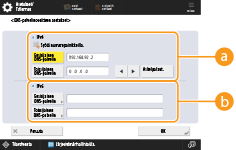 2 | Suorita tarvittavat asetukset. Kirjoita DNS-palvelimen IP-osoite ympäristösi mukaan. ![]() Lisätietoja asetuksista saat palveluntarjoajaltasi tai verkon pääkäyttäjältä. ![]() <IPv4>Valitse <Ensisijainen DNS-palvelin> ja kirjoita DNS-palvelimen IPv4-osoite. Jos käytössä on toissijainen DNS-palvelin, kirjoita sen IP-osoite. Jos et aseta toissijaista DNS-palvelinta, kirjoita "0.0.0.0". <IPv6>Valitse <Ensisijainen DNS-palvelin> ja kirjoita DNS-palvelimen IPv6-osoite. Osoitteita, jotka alkavat "ff" (multicast-osoite), osoitteita, joissa on vain "0", tai paikallisia linkkiosoitteita ei voida lisätä. Jos käytössä on toissijainen DNS-palvelin, kirjoita sen IP-osoite. Osoitteita, jotka alkavat "ff" (multicast-osoite), osoitteita, joissa on vain "0", tai paikallisia linkkiosoitteita ei voida lisätä. Tämä sarake voi jäädä tyhjäksi. |