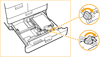 | Druk op het bovenste gedeelte van de voorkantgeleider en verschuif hem totdat hij op een lijn staat met het tabbladpapier. |