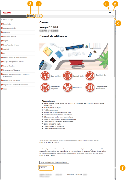 Clique para visualizar informações sobre como ver o Manual do utilizador, como efetuar uma procura e outras informações.