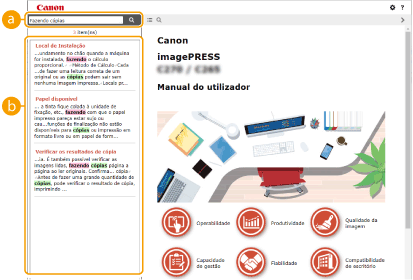 Apresenta os resultados de procura das páginas que contêm as palavras-chave especificadas. A partir dos resultados, localize a página procurada e clique no título do tópico da página.
