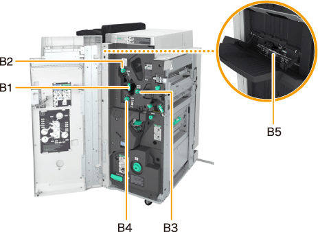 Поверните ручки (B3, B4) и проверьте наличие замятия бумаги.