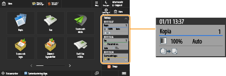 De senaste 10 objekten i historiken sparas som tidslinjen i kronologisk ordning. Historiken över tidigare jobb tas bort från tidslinjen. När jobbet före det sista jobbet används igen, växlas ordningsföljden för de två översta jobben men antalet jobb i tidslinjen ändras inte. Om inställningarna ändras efter att de återkallats, anses de vara nya inställningar. ![]() Om du vill ta bort historik som automatiskt lagts till eller lagra inställningar för historiken på <Hem>-skärmen som en personlig knapp/delad knapp, håller du ned historiken. Men <Visa bekräftelsedisplay vid återkallning> och <Påbörja återkallning (Åtgärden påbörjas när knappen trycks in.)> kan inte ställas in vid registrering av personlig knapp/delad knapp från tidslinjen. Registrera personliga knappar/delade knappar Om <Begränsa omsändning från logg> har ställts in på <På>, lagras historiken för "Fax" och "Scanna och skicka" inte på tidslinjen. Följande lösenord kan inkluderas i tidslinjen för alla inloggade användare. Inloggningslösenord för mottagarfilsservrar för Scanna och skicka Inloggningslösenord för Rights Management-servrar för Scanna och skicka Inloggningslösenord för Rights Management-servrar för Scanna och lagra Krypteringslösenord för Scanna och lagra (<Lösenord krävs för att öppna dokument> och <Lösenord krävs för att ändra behörighet>) Om lösenordet i tidslinjen för den inloggade användaren ska ingå, kan ändras i <Förhindra cachning av autentiseringslösenord>. Lösenordet i <Lösenord> för faxfunktionen sparas i tidslinjen oavsett inställningen för <Förhindra cachning av autentiseringslösenord>. Lösenordet sparas inte i tidslinjen för obehöriga användare eller gäster oavsett inställningen för <Förhindra cachning av autentiseringslösenord>. Om lösenordet i <Lösenord> för faxfunktionen har ställts in, visas det inte på tidslinjen. Om <Hantera åtkomstnummer för adressböcker> har ställts in på <På>, visas sändjobbloggen ("Fax" och "Scanna och skicka") inte för obehöriga användare och gäster på tidslinjen. Inställningshistoriken för den inloggade användaren kan delas med flera maskiner som anpassade data med hjälp av synkronisering för inställningar. Lista över objekt som kan ges egna inställningar Med Åtkomst lagrade filer sparas filerna till tidslinjen tillsammans med inställningarna som de skrivs ut med. Du kan inte välja en annan fil och återanvända enbart inställningarna. Inte heller de relaterade tidslinjeinställningarna kan användas om en fil har raderats eller flyttats. |
