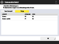 <Återstående dagar> visar förväntat antal dagar tills byte krävs, baserat på senaste användning. Även om <Byte krävs> visas i <Återstående dagar>, behöver du inte byta förrän ett meddelande om att du ska byta förbrukningsartiklar visas i statusvisningsområdet (längst ned på pekskärmen). Mätningen av <Återstående dagar> görs inte förrän en stund efter att maskinen har startats och <1 år eller mer> visas under tiden. Återstående dagar som visas efter den här tidpunkten kan tillfälligt vara mycket få. |