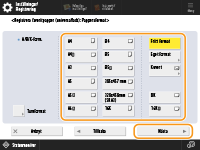 2 | Välj orientering och typ av kuvert. ![]() Om du ändrat placeringen av kuverten trycker du på <Kortsida matas> eller <Långsida matas> och väljer kuverttyp. När du vill registrera ett kuvert i eget format, tryck på <Eget> <Nästa> och tryck på <X> eller <Y> för att ange sida. Använd sedan sifferknapparna för att ange längd på angiven sida. |