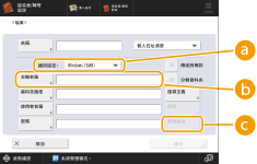 1 | 輸入傳輸資料的檔案伺服器/進階郵件信箱 主機名稱。 ![]() 詢問網路管理員關於檔案伺服器/進階郵件信箱 的資訊。 <通訊協定>從 <Windows (SMB)>、<FTP> 和 <WebDAV> 選擇檔案伺服器的通訊協定。 將文件傳送至 進階郵件信箱 時,請選擇 <Windows (SMB)> 或 <WebDAV>。 ![]() 如果選擇 <Windows (SMB)>,將會顯示 <搜尋主機> 和 <瀏覽> 按鈕。搜尋或檢視網路即可輕鬆指定檔案伺服器/進階郵件信箱。 如果在 <指定SMB用戶端版本> 中將 <1.0> 設定為 <開啟>,您僅能使用 <瀏覽>。 最多可以註冊五個用於 <瀏覽> 的 Directory 伺服器。 <主機名稱>輸入檔案伺服器/進階郵件信箱 的主機名稱。 如果在通訊協定中選擇 <FTP>,請依下列說明輸入 <主機名稱>。 TLS 停用時 範例: 若要儲存至共用空間:ftp://主機名稱/share 若要儲存至個人空間:ftp://主機名稱/users TLS 啟用時 範例: 若要儲存至共用空間:ftps://主機名稱/share 若要儲存至個人空間:ftps://主機名稱/users 將文件傳送至 進階郵件信箱 時,請依下列說明輸入 <主機名稱>。 如果在通訊協定中選擇 <Windows (SMB)> 範例: 若要儲存至共用空間:\\192.168.100.50\share 若要儲存至個人空間:\\192.168.100.50\users 如果在通訊協定中選擇 <WebDAV> TLS 停用時 範例: 若要儲存至共用空間:http://<IP 位址或主機名稱> 若要儲存至個人空間:http://<IP 位址或主機名稱> TLS 啟用時 範例: 若要儲存至共用空間:https://<IP 位址或主機名稱> 若要儲存至個人空間:https://<IP 位址或主機名稱> <檢查連線>輸入主機名稱後按下此按鈕,向檔案伺服器/進階郵件信箱 確認連線。 ![]() 如果您使用個人認證管理等登入服務,必須輸入 <使用者名稱> 和 <密碼>。 |