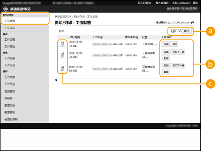 使用個人認證管理時,您可在 <狀態確認> 畫面上限制使用者對其他使用者的工作執行作業。<限制存取其他使用者的工作>